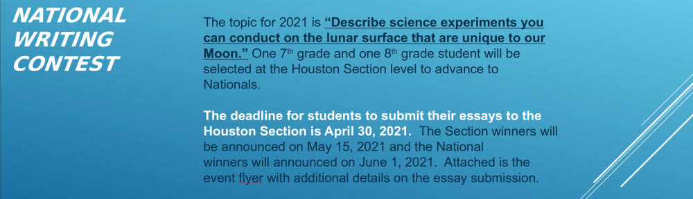 The topic for 2021 is “Describe science experiments you can conduct on the lunar surface that are unique to our Moon”. One 7th grade and one 8th grade student will be selected at the Houston Section level to advance to Nationals.